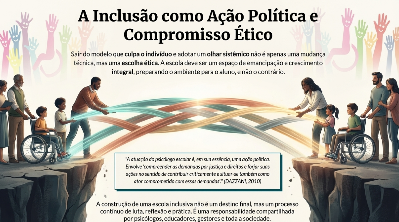 • Intervenção Institucional: Avalia a escola como um todo — suas práticas, cultura e políticas — para identificar e ajudar a remover barreiras estruturais que impedem a inclusão. Essa é uma ação política, na qual o psicólogo se compromete com as demandas por justiça e direitos dentro do sistema, atuando como um verdadeiro agente de transformação.
